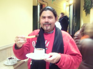 En fin, eso, la vida es una sola, y vale la pena disfrutar cada segundo de los misterios del chocolate.  ¿Y si nos tomamos un buen café con leche caliente en medio de noviembre, en medio de París?  ¿O qué tal una tazona de chocolate caliente con churros en Madrid? (foto, der.)  No, coño, no, mi socio, ya tú quieres demasiado.