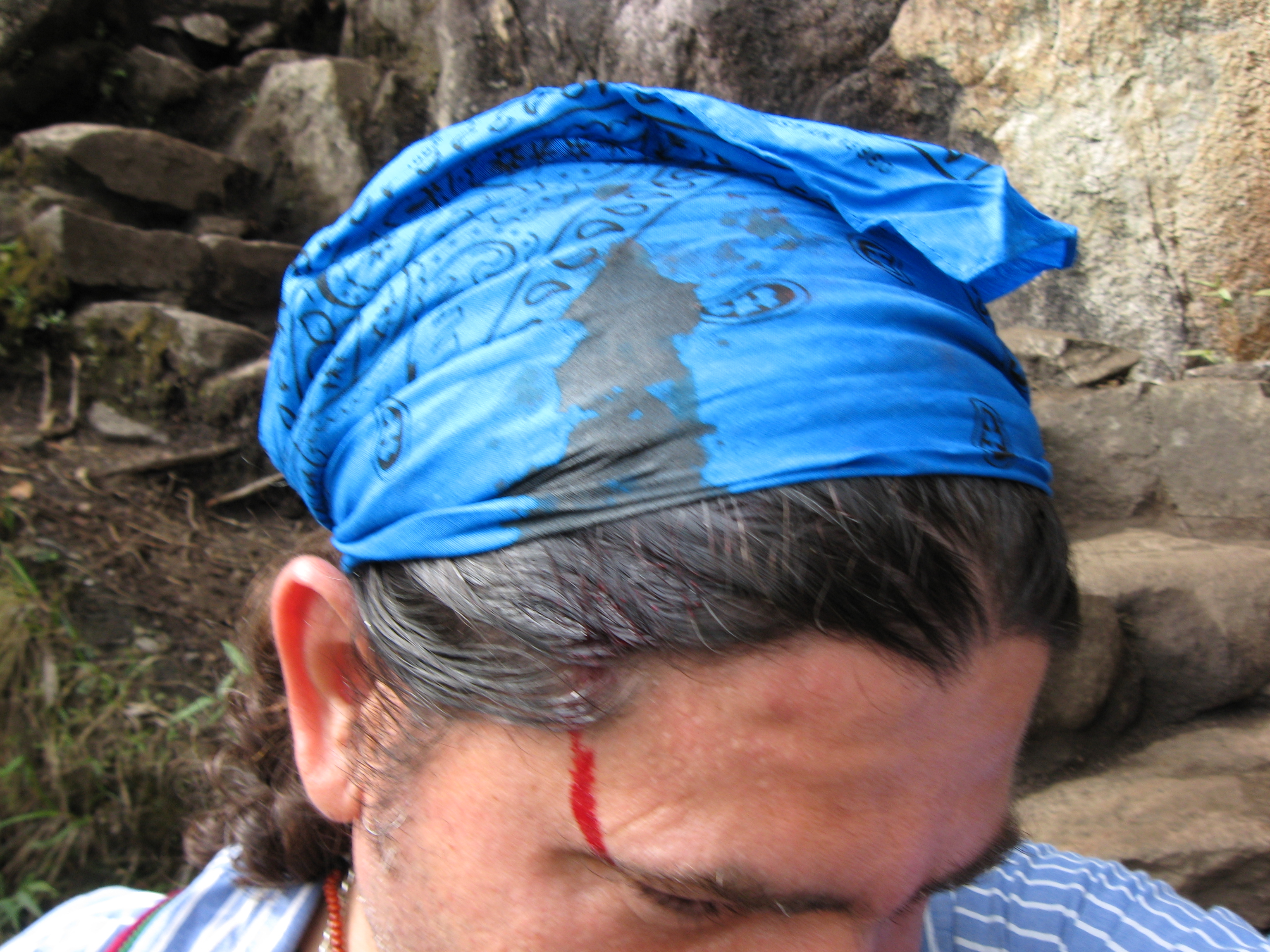 Me amarré una bandana azul que llevaba. Me la apreté tan fuerte, coño, que casi se me zafan las orejas de la cabeza, digo yo. Tenía que amarrarme bien el pañuelo o bandana porque eso detendría el flujo de sangre que salía no a borbotones, pero si en chorritos, no creas, de la herida. Todavía no sabía cuán grande era la herida, pero no lo iba a averiguar. Intenté con mi cámara digital tirarme una foto a la herida, para ver cuán grave era el asunto, pero ante la urgencia de bajar, y la tontería de la fotico, con lo cual podría perder un tiempo precioso y posiblemente irrecuperable, pues entonces escogí irme al seguro, y comenzar el descenso inmediatamente que estaba ya seguro de que la visión de los dos ojos, el balance, y las habilidades motoras no estaban afectadas.